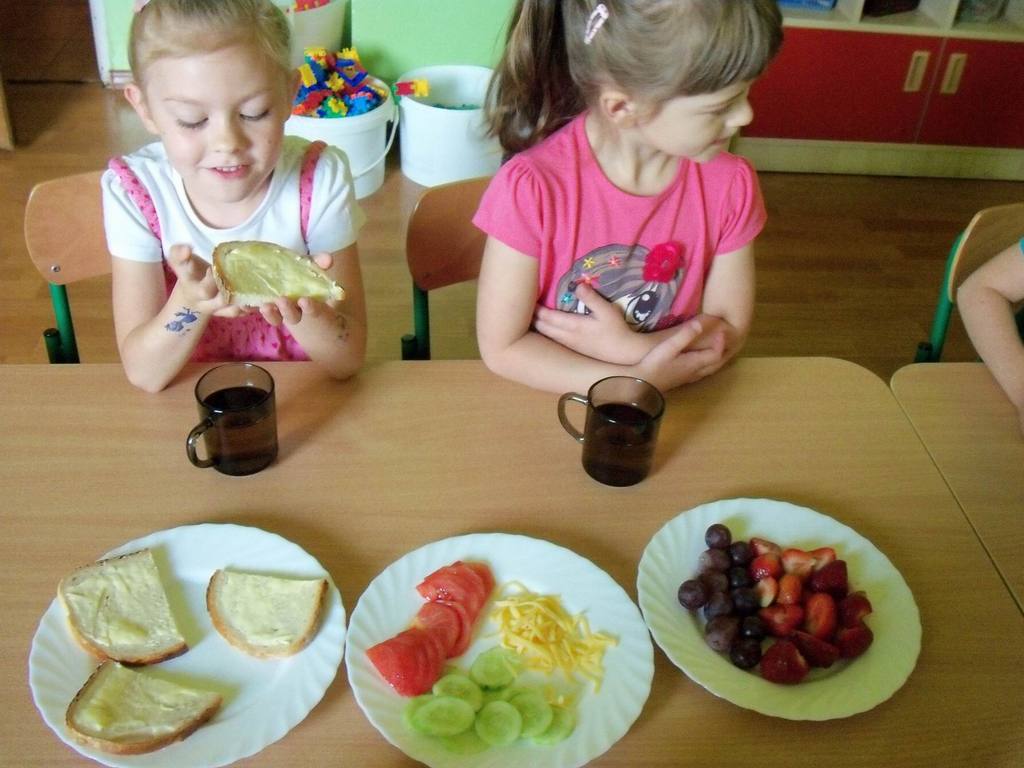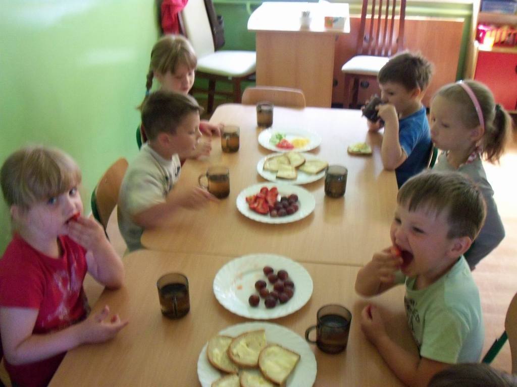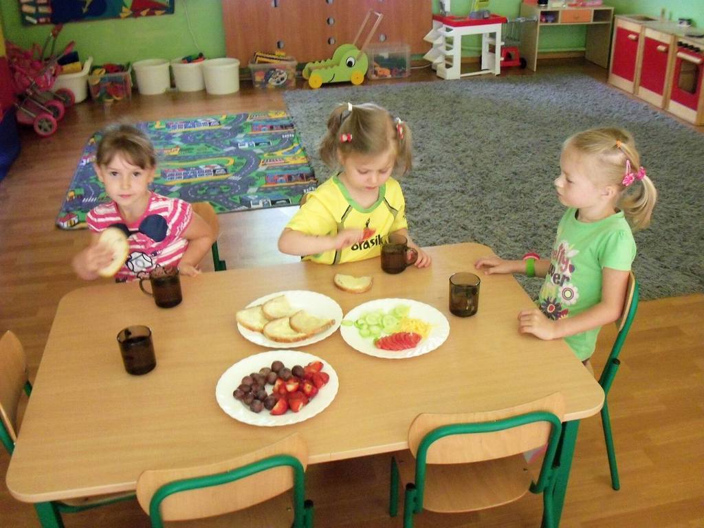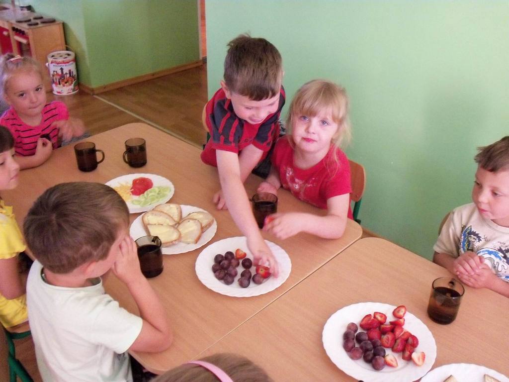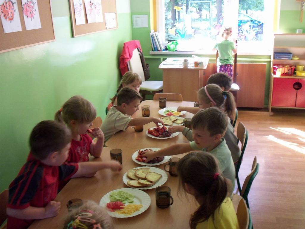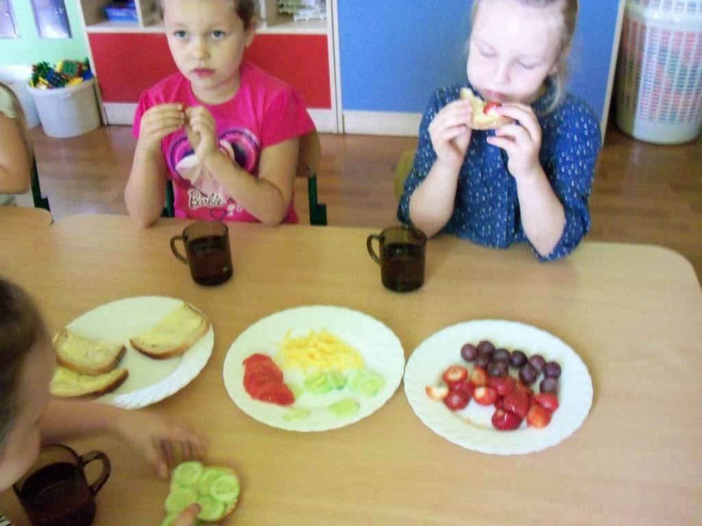 Dzieci w przedszkolu nie tylko mają wyznaczony czas na naukę, ale proces ten trwa cały dzień, począwszy od śniadania. Na przedszkolnych stolikach bardzo często-jeśli to tylko możliwe- posiłki są bardzo kolorowe i urozmaicone. Staramy się tym samym zachęcać dzieci do kosztowania nowych rzeczy, jak i przekazać zdrowe nawyki żywieniowe. W piątek na talerzach pojawiły się oprócz pomidorów, ogórków czy żółtego sera owoce- winogrona, truskawki,arbuz,gruszki, jabłka. Dzieci mają okazję wtedy samodzielnie komponować swoje kanapki i przekąski.