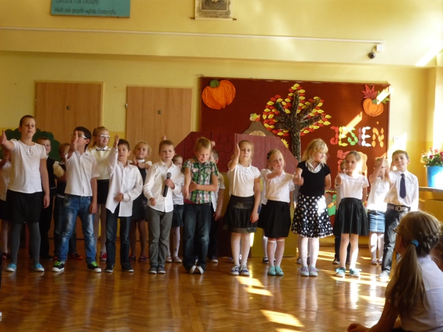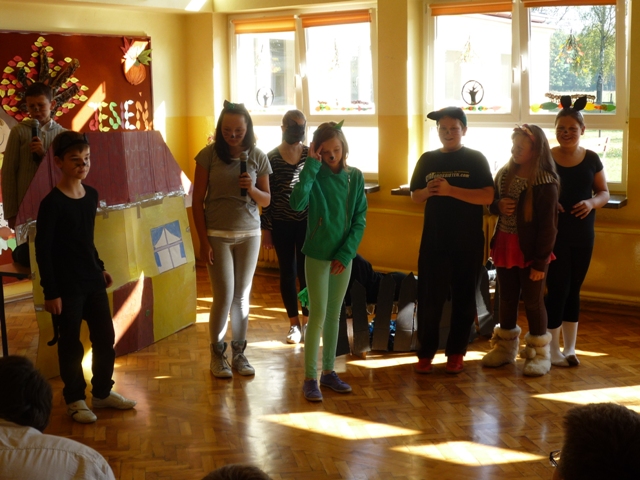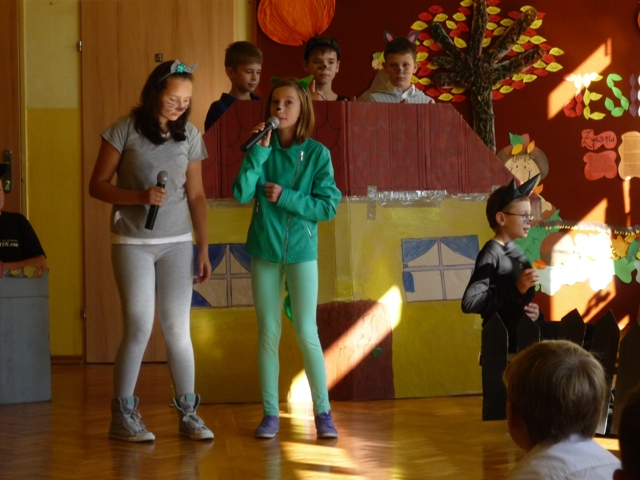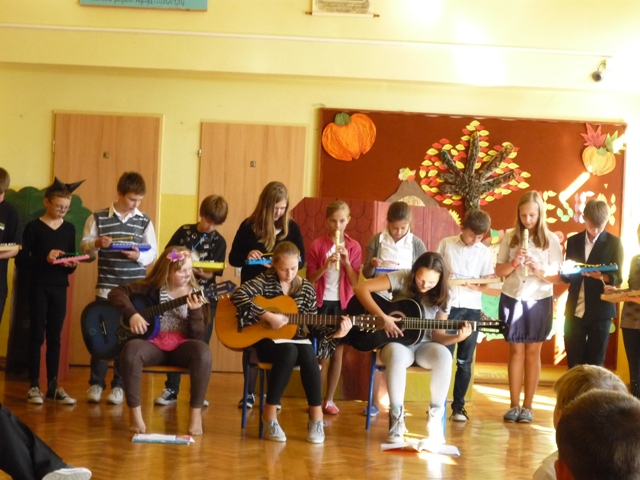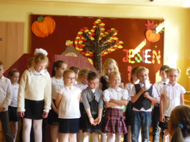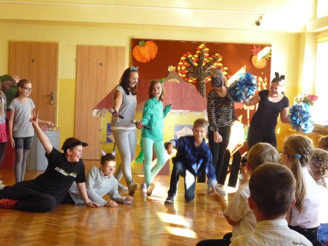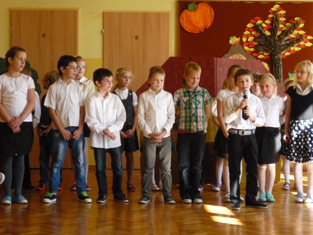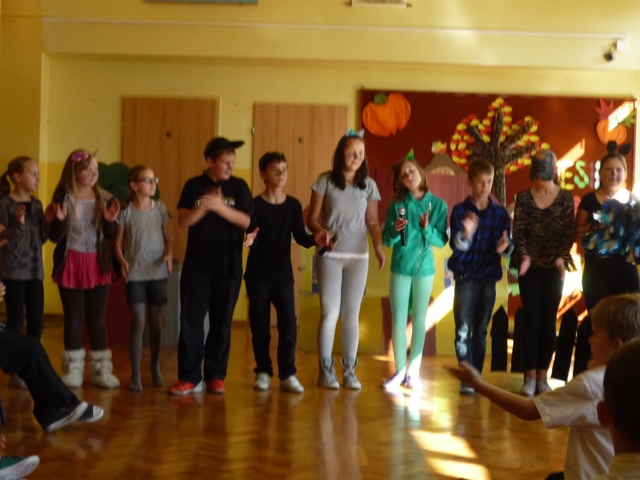 Piątek 10 października był w naszej szkole dniem uroczystym albowiem obchodziliśmy uroczyście Dzień Edukacji Narodowej zwany kiedyś Dniem Nauczyciela. Elegancko ubrani Uczniowie,Nauczyciele oraz zaproszeni Goście spotkali się na szkolnym holu, by wziąść udział w akademii. W tym roku uczniowie klasy V zaprezentowali krótkie przedstawienie pt. Zielony Pies, które miało na celu uświadomienie widzom, jak ważna jest w dzisiejszych czasach tolerancja oraz pozostawanie sobą, nawet gdy inni chcą nas zmienić. Uczniowie klasy II i III wyrazili wdzięczność swoim Padagogom poprzez recytację wierszy i śpiewanie piosenek. Na samym końcu uczniowie klas starszych zaprezentowali swoje muzyczne talenty, wykonując instumentalny utwór "Łabędzia rzeka". Były też życzenia i kwiaty. W doskonałych humorach wszyscy rozeszli się do domów (w końcu w perpektywie mamy bardzo dłuuugi weekend).