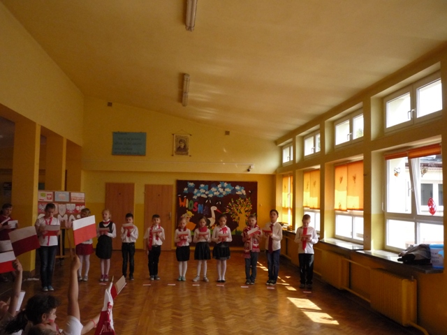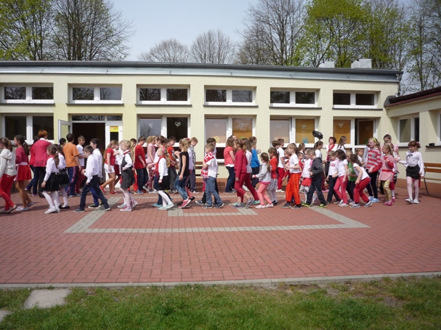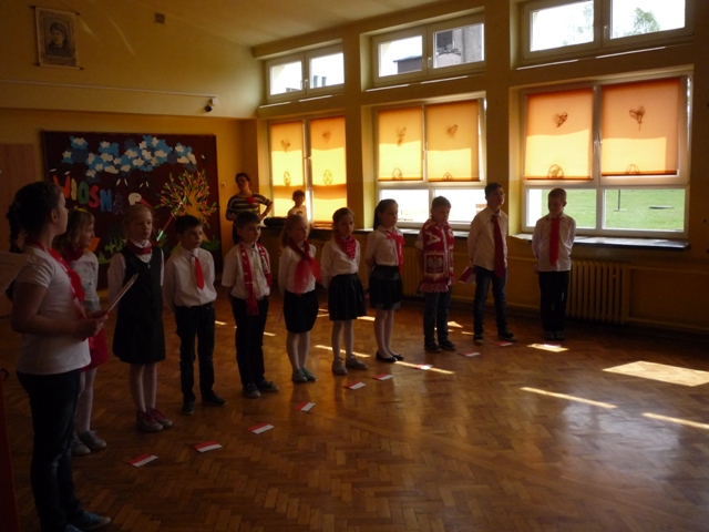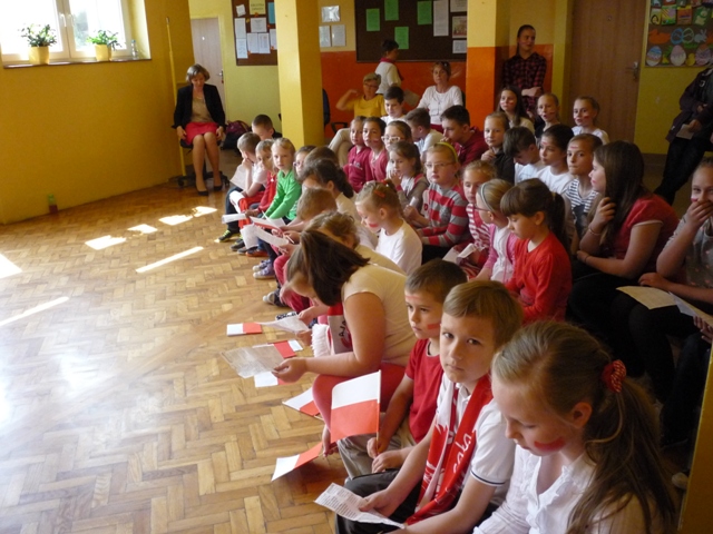Ważnym elementem naszego szkolnego życia jest uroczyste obchodzenie ważnych dla Polaków świąt zapisanych w polskim kalendarzu. Zwłaszca święta narodowe są okazją do wprowadzanie elementów wychowania patriotycznego, bo to przecież już niebawem przyszłe pokolenia bedą kształtować naszą Ojczyznę. Tuż przed Majówką, w czwartek, po raz kolejny obchodziliśmy dzień biało - czerwony (prawie wszyscy uczniowie przybyli w ten dzień przybrani w polskie barwy narodowe), uczniowie klasy III i V przygotowali spektakl słowno-muzyczny związany z obchodami Święta Konstytucji 3 Maja, a na koniec prowadzeni przez panią Dorotę Wołowczyk wspólnie zatańczyliśmy poloneza.