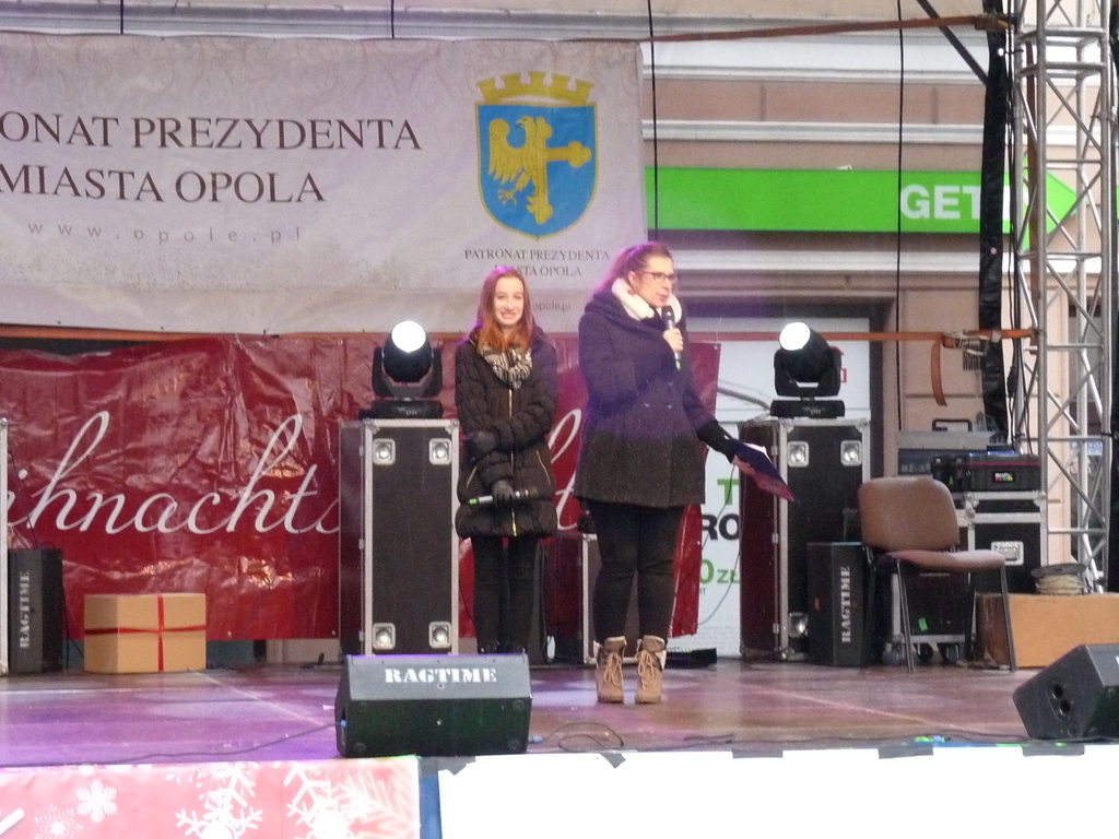 W ubiegłą niedzielę- 13 grudnia- uczennica klasy VI naszej szkoły- Zuzanna Ortman zdobyła wyróznienie w Opolskim Konkursie Niemieckiej Piosenki Bożonarodzeniowej zorganizowanym przez Związek Młodzieży Mniejszości Niemieckiej. Zuzia przeszła eliminacjie i dostała się do finału konkursu. Kolędę "Stille Nacht" wykonywała na opolskim rynku podczas Jarmarku Bożonarodzeniowego.
