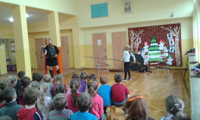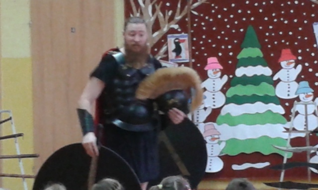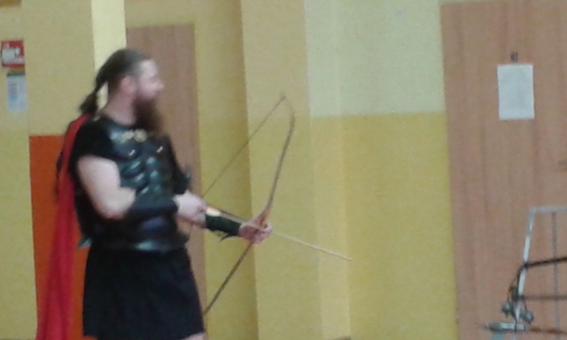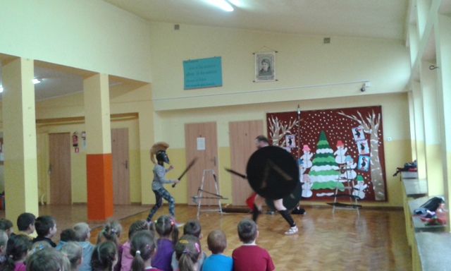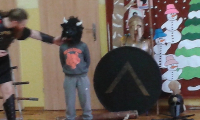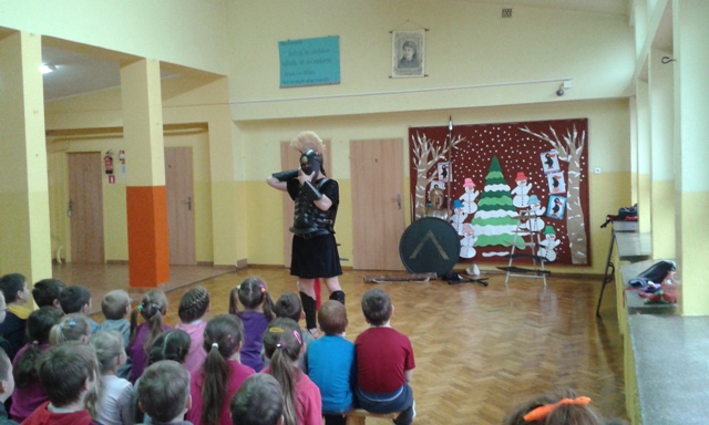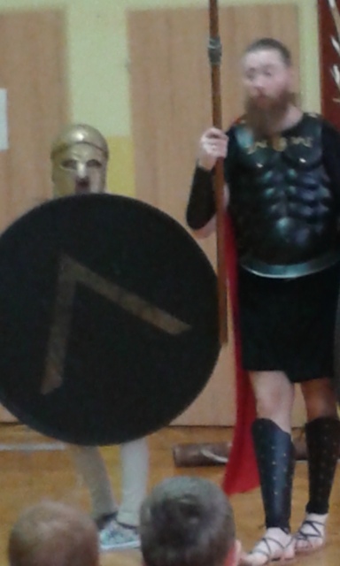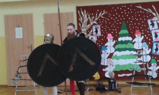 29 lutego gościliśmy w szkole aktora- przedstawiciela gupy rekonstrukcyjnej, który zaprezentował uczniom "żywą" lekcję historii o starożytnej Grecji. W stroju greckiego żołnierza, czyli hoplity, niezwykle ciekawie opowiadał o historii, kulturze, mitologii greckiej. Prezentował broń Greków i Persów, ich uzbrojenie i sposoby walki. Wybrani uczniowie mieli okazję przymierzyć hełm, poczuć się jak w starożytnej Sparcie, czy też stanąć do walki na miecze... Uczniom podobała się taka lekcja, a jedno z pytań, jakie zadano na końcu brzmiało: Kiedy znowu Pan do nas przyjedzie?