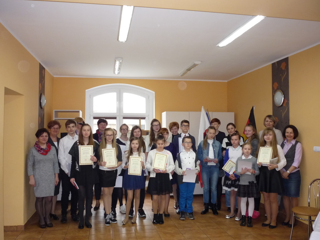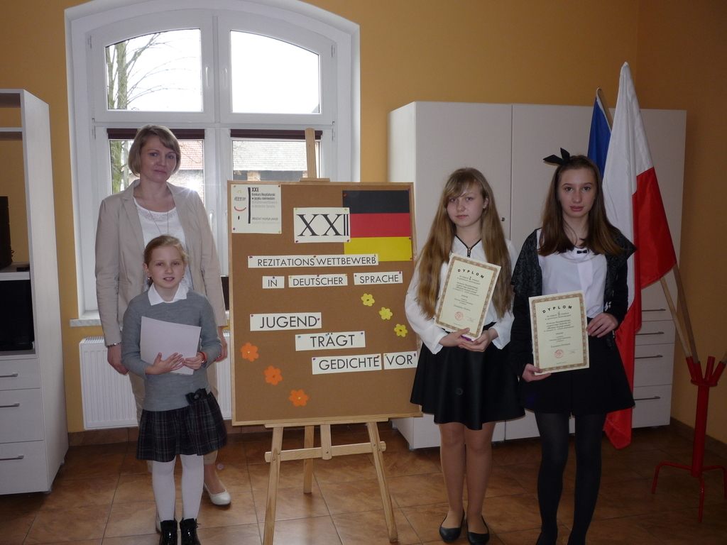 Dnia 12 kwietnia 2016 r. odbył się XXII Konkurs Recytatorski w Języku Niemieckim „Jugend trägt Gedichte vor” . Konkurs ten ( eliminacje gminne) odbył się po raz drugi w Pludrach, w budynku Starej Szkoły. W konkursie wzięło udział 13 uczniów ze szkół podstawowych z całej gminy. Naszą szkołę reprezentowali uczniowie klasy czwartej i szóstej: Aleksandra Broll, Dominika Hońca oraz Zuzanna Ortman. Wszyscy uczniowie naszej szkoły zakwalifikowali się do kolejnego etapu konkursu, który odbędzie się 12 maja w Oleśnie. Najlepsze w tegorocznym konkursie recytatorskim w kategorii szkół podstawowych były Aleksandra Broll oraz Dominika Hońca zajmując pierwsze miejsce. Wszystkim zwycięzcom serdecznie gratulujemy i życzymy dalszych sukcesów.