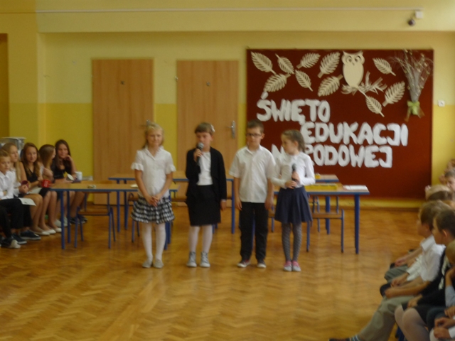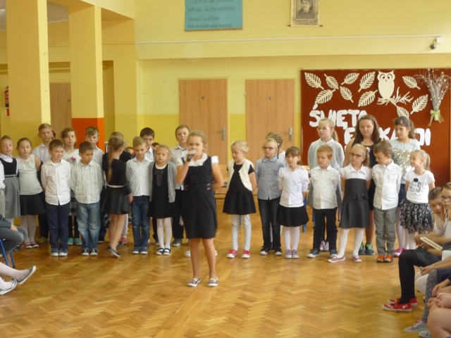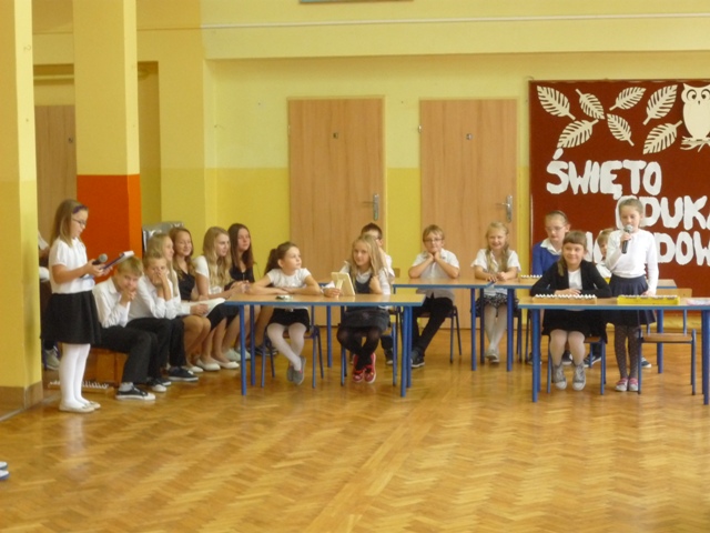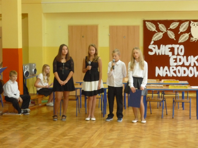 13 pażdziernika obchodziliśmy Dzień Edukacji Narodowej. Z tej okazji zaproszeni goście, nauczyciele i uczniowie obejrzeli występ przygotowany przez uczniów klasy II - VI. Oprócz życzeń i tradycyjnego "Sto lat", zaprezentowano humorystyczne scenki o tematyce szkolnej, piosenki wraz z akompaniamentem na gitarach i cymbałkach,a także wiersze.