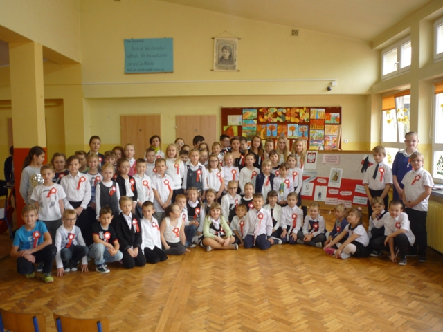 10 listopada uczniowie klas IV - VI zaprezentowali swoim młodszym kolegom przedstawienie poświęcone narodowenu Świętu Odzyskania Niepodległości. Zaprezentowali najważniejsze fakty i postaci zwiazane z tym wydarzeniem, recytowali wiersze i śpiewali piosenki żołnierskie i patriotyczne. Aby podkreślić rangę tego święta wszyscy przypięli biało - czerwone kotyliony, na koniec uczniowie ustawili się do wspólnej fotografii.