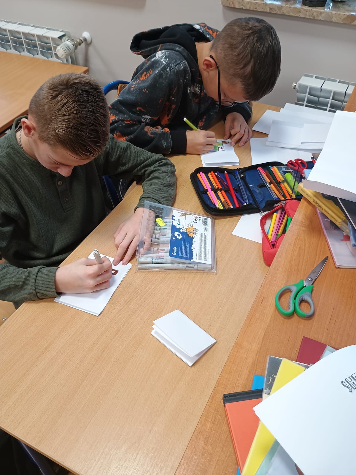 Weronika: "Dzisiejsze warsztaty komiksowe rozpoczęły się od krótkiego przedstawienia czym są komiksy i mangi, jakie tematy najczęściej poruszają, co je charakteryzuje i jak powinno się je czytać. Mieliśmy również możliwość przejrzenia sobie paru egzemplarzy. Na końcu pani z biblioteki opowiedziała nam również o zinach, czyli małych książeczkach z różnymi historyjkami, a następnie sami mogliśmy takie wykonać"