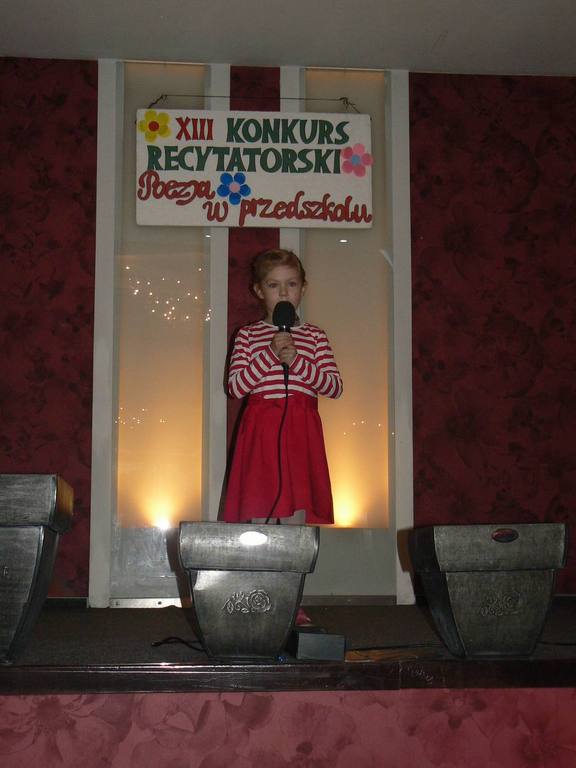 Dnia 10 kwietnia w Dobrodzieniu w Hotel Parku odbył się XIII konkurs poezji przedszkolnej. Nasze przedszkole reprezentowały Zuzia Łuc z grupy młodszej i Alicja Mlynek z grupy starszej. Obie dziewczynki wypadły bardzo dobrze zostały nagrodzone przez publiczność gromkimi brawami jak i przez jury nagrodami książkowymi i pamiątkowymi dyplomami.