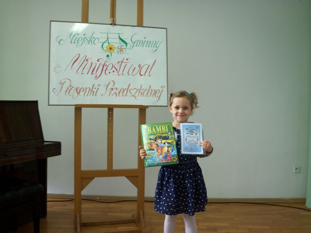 Dnia 8 maja 2014r. w Miejskim Domu Kultury w Dobrodzieniu odbył się Minifestiwal piosenki przedszkolnej. Nasze przedszkole reprezentowała Patrycja Magdzińska z grupy starszaków. Dziewczynka wypadła wspaniale, śpiewała piosenkę pod tytułem "Przyjaciel Przyrody", otrzymała gromkie brawa, dyplom oraz książkę.